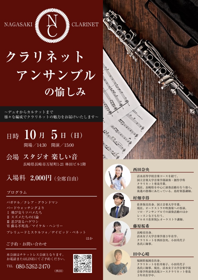| 5 | 日 | クラリネットアンサンブルの愉しみ | スタジオ楽しい音 | 15:00 | 2,000円 |